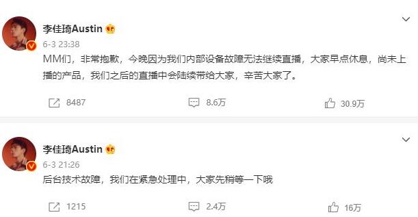 李佳琦直播還沒結(jié)束的時(shí)候,直播突然中斷了。直播被中斷之后,李佳琦就發(fā)布了一條微博信息因后臺(tái)技術(shù)故障,直播暫停。兩個(gè)小時(shí)后,李佳琦又發(fā)布了一條微博信息稱因內(nèi)部設(shè)備故障不能繼續(xù)開播,尚未上播的產(chǎn)品會(huì)在后面的直播中陸續(xù)上播。然而,直到618前夕,李佳琦也未曾恢復(fù)直播。