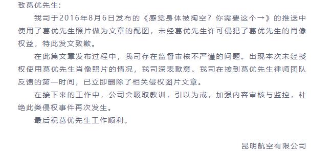 據(jù)報(bào)道,3月16日,昆明航空就引用演員葛優(yōu)圖片做配圖,向其發(fā)布致歉聲明,未經(jīng)許可使用葛優(yōu)先生照片做為配圖,特此發(fā)文致歉。聲明全文為。